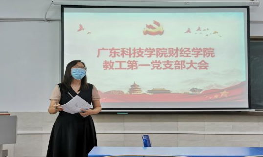 2022年6月15日,财经学院教工第一党支部全体党员在教学楼1-401召开支部大会,会议由钟艳婷老师主持,本次会议活动主题为深入学习贯彻广东省第十三次党代会精神。