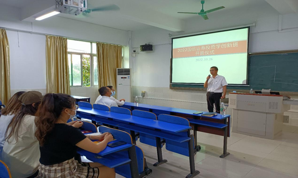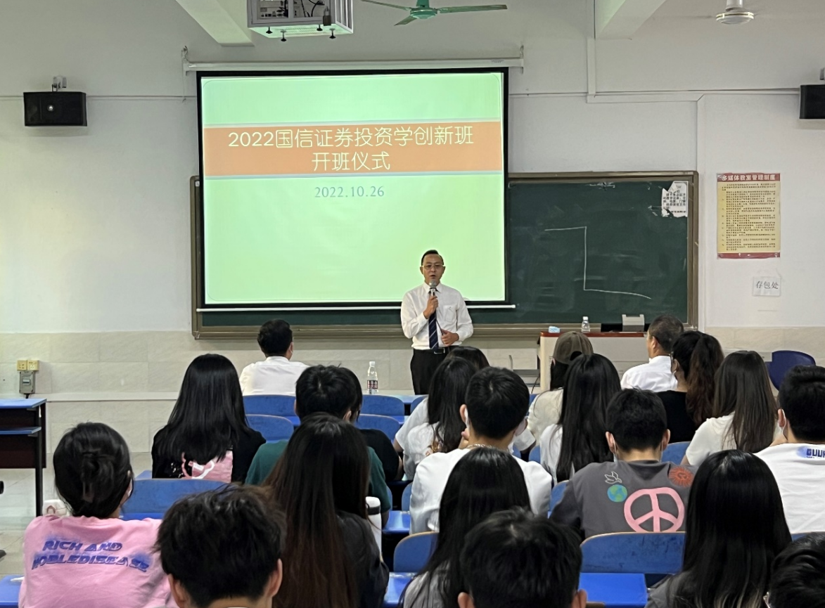 10月26日下午,2022国信证券投资学创新班正式开班。出席本次开班仪式的有国信证券东莞虎门营业部总经理廖长胜先生、国信证券虎门营业部理财顾问吴炳辉先生、广东科技学院财经学院郝德鸿院长、广东科技学院财经学院投资学专业建设负责人陈肯界老师、国信证券虎门营业部其他工作人员以及2020级投资本科1-2班63位学生。