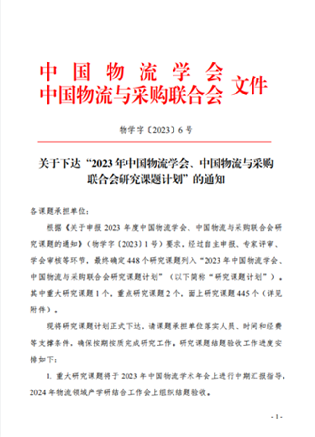 近日,根据《中国物流学会关于下达“2023年中国物流学会、中国物流与采购联合会研究课题计划”的通知》,管理学院贾帆帆、赵静、唐业富、卢敏、戴汇川、叶芬芳、曹青、喻霞共8位老师申报的项目获得立项。