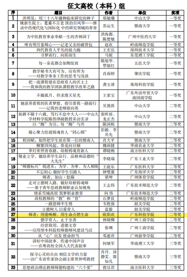 根据《广东省教育厅关于开展2022年师德建设主题教育月活动的通知》精神,管理学院在全体教职工中开展了以“迎接党的二十大 培根铸魂育新人”为主题的师德教育征文活动,教职工踊跃参与,积极投稿。经过学院、学校、省教育厅多轮评选,最终,我院推荐的物流管理专业欧阳欢老师的作品《师者:用爱唤醒,用生命点燃生命》在征文高校(本科)组中喜获二等奖。