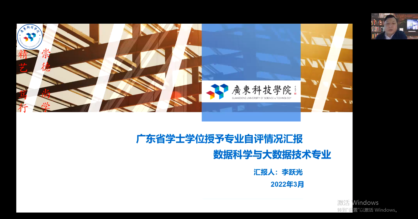 专业建设负责人李跃光教授从专业建设情况、人才培养方案、师资队伍、教学条件及利用、教学过程与管理、实践教学、毕业论文、专业特色与改进措施等8个方面详细汇报数据科学与大数据技术专业的建设成效和人才培养效果。