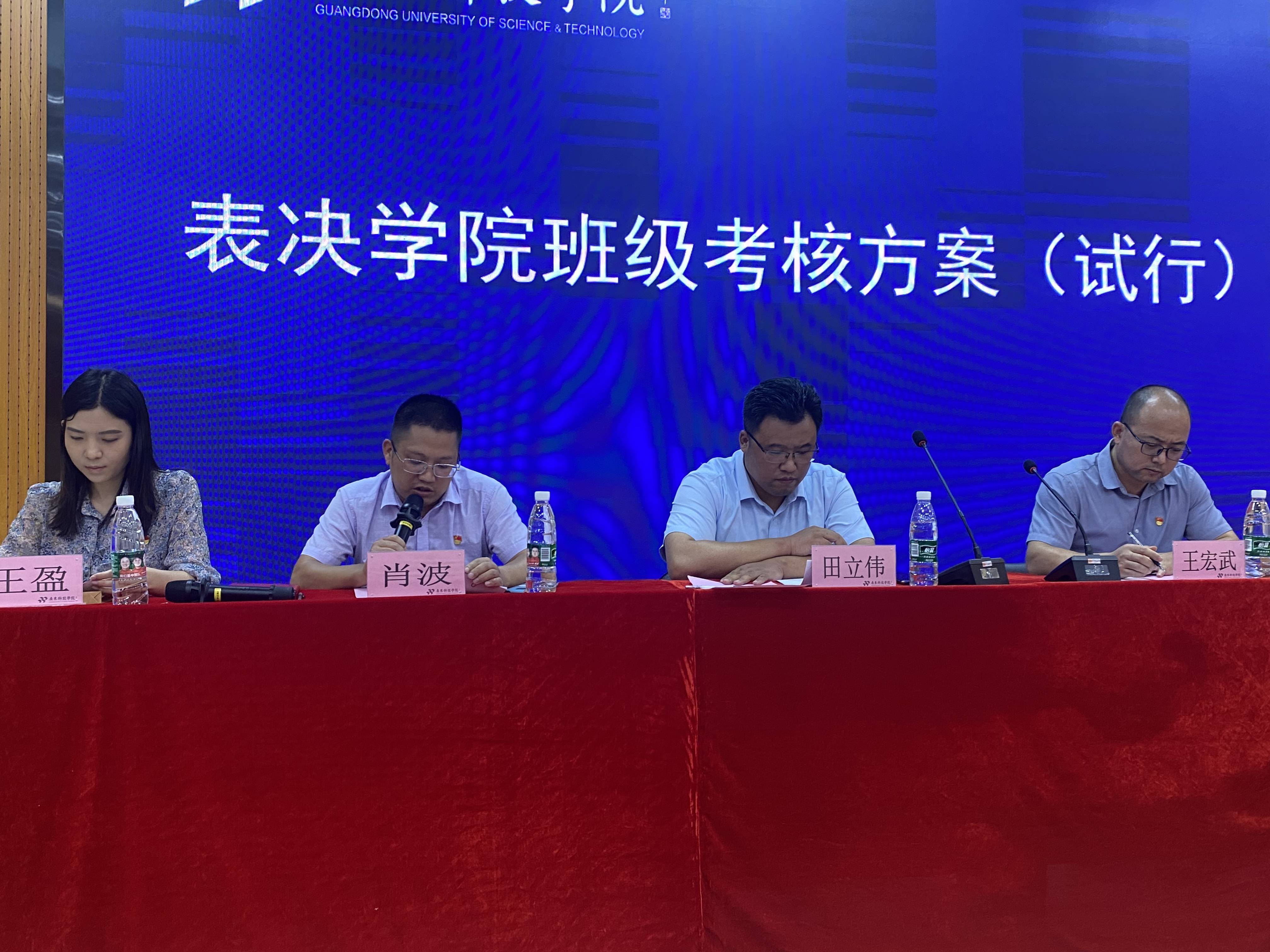 学院党委副书记、副院长肖波就《学院班级考核方案(试行)》、《广东科技学院“支部建在专业上” 基层党支部建设工作 方案(试行)》进行解读,结合方案提出的背景,就方案的细则给大家做了梳理和明确,帮助与会人员更好地理解和落实相关工作。此外,就七一表彰先进集体与个人推荐名单、学院教工、学生各支部书记、支委建议名单在大会上提出,与会人员进行表决。
