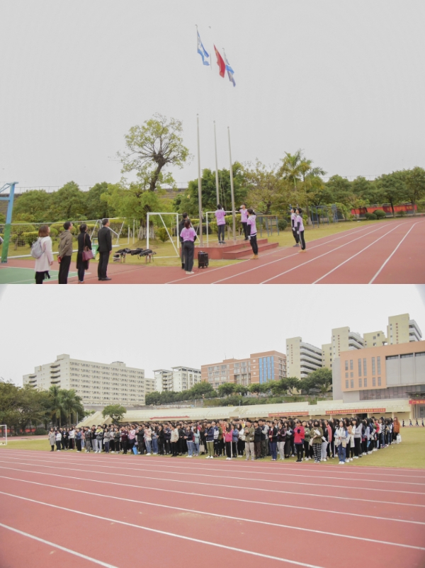 2017年11月20日7:00,早冬的清晨寒气袭人,但同学门早早到达操场,整齐站好,准备迎接军训以来第一次升旗仪式。出席本次升旗仪式的有:学院副书记、院长陈标新教授,艺术设计系学工主任胡萍老师,教学主任刘亚军老师,党小组指导老师苏德银老师,团总支书记、学生会指导老师黎小棠老师,第十二届党小组、团总支学生会成员以及17级艺术设计系全体同学。